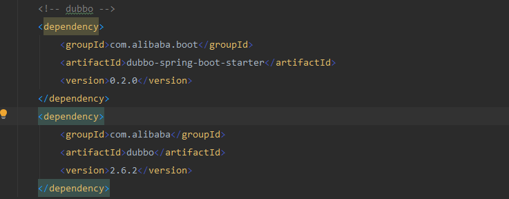 | <?xml version="1.0" encoding="UTF-8"?> <project xmlns="http://maven.apache.org/POM/4.0.0" xmlns:xsi="http://www.w3.org/2001/XMLSchema-instance" xsi:schemaLocation="http://maven.apache.org/POM/4.0.0 https://maven.apache.org/xsd/maven-4.0.0.xsd"> <modelVersion>4.0.0</modelVersion> <parent> <groupId>com.aias</groupId> <artifactId>demo</artifactId> <version>0.0.1-SNAPSHOT</version> </parent> <groupId>com.aias</groupId> <artifactId>demoProvider</artifactId> <version>0.0.1-SNAPSHOT</version> <name>demoProvider</name> <description>Demo project for Spring Boot</description> <dependencies> <dependency> <groupId>com.aias</groupId> <artifactId>common</artifactId> <version>0.0.1-SNAPSHOT</version> </dependency> <!-- mybatis --> <dependency> <groupId>org.mybatis.spring.boot</groupId> <artifactId>mybatis-spring-boot-starter</artifactId> <version>2.1.0</version> </dependency> <!-- druid --> <dependency> <groupId>com.alibaba</groupId> <artifactId>druid-spring-boot-starter</artifactId> <version>1.1.10</version> </dependency> <!-- mysql-connector --> <dependency> <groupId>mysql</groupId> <artifactId>mysql-connector-java</artifactId> </dependency> <!-- dubbo --> <dependency> <groupId>com.alibaba.boot</groupId> <artifactId>dubbo-spring-boot-starter</artifactId> <version>0.2.0</version> </dependency> <dependency> <groupId>com.alibaba</groupId> <artifactId>dubbo</artifactId> <version>2.6.3</version> </dependency> </dependencies> </project>